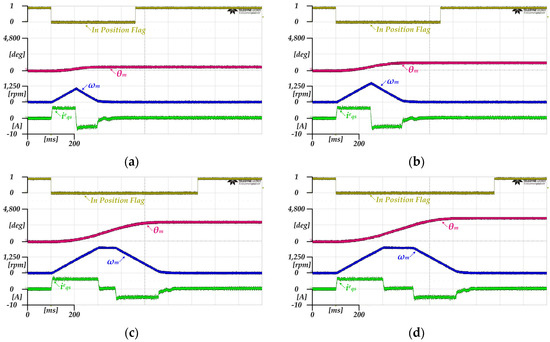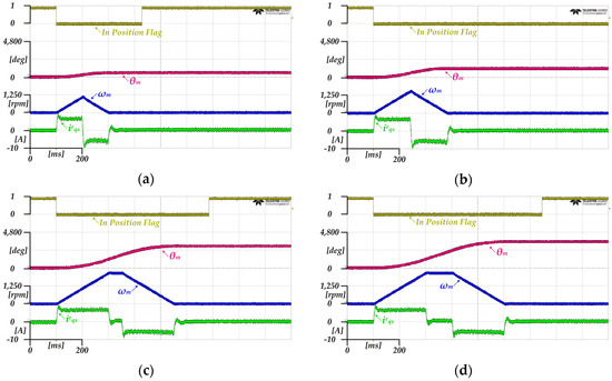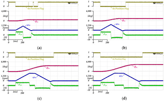 Figure 8 shows the position, velocity and q-axis current of the time-based profile generator. “In Position Flag” means that the absolute value of the error between the position reference and the actual position is less than 0.225 [deg] corresponding to 5 pulses of the encoder. The position reference is inputted at 100 [ms]. Then, the position error exceeds the allowable position error, 0.225 [deg], and “In Position Flag” is cleared to 0. When the position references are 600 [deg] and 1200 [deg], the velocity trajecories show the triangular shapes as shown in Figure 8a,b. In the acceleration and deceleration regions of the triangular profile, the magnitude of the q-axis current is 7[A] and almost flat. The velocity increases with the constant ratio. In Figure 8a, the actual position is considered to reach the position reference because the position error is less than the allowable position error after 430 [ms], when “In Position Flag” returns to 1. However, in the case of Figure 8b, the flag remains 0 and it means the actual position cannot reach within the range of “In Position”. The trapezoidal velocity profile occurs when the position references are 3000 [deg] and 3600 [deg] as shown in Figure 8c,d. The control results are similar with the results of the triangular profile except for the constant velocity region. The velocity of the trapezoidal profile increases to the maximum velocity and keeps the maximum velocity for a moment. The time of the constant velocity region varies depending on the position reference. The transient response time of 3000 [deg] and 3600 [deg] are 580 [ms] and 640 [ms], respectively. The actual position of the two cases reach the references.