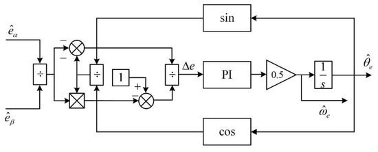 The structure of the tangent-based PLL is shown in Figure 5. When the system achieves the steady point, rotor position can be calculated as