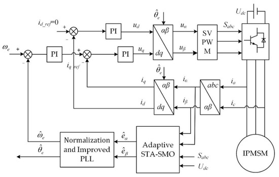 The control diagram of proposed sensorless control strategy for IPMSM based on adaptive STO and improved PLL is shown in Figure 8. The double closed-loop vector control is adopted. The details of the adaptive STO and the improved PLL are shown in Figure 2 and Figure 6, respectively.