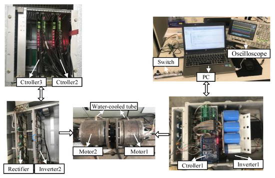 An experimental prototype is shown in Figure 9 and the corresponding experimental platform was established as shown in Figure 10. The platform is mainly composed of two water-cooled IPMSMs, one rectifier, two inverters, and three controllers. The motor 1 is connected with inverter 1, and the proposed strategy is implemented by the controller 1. The motor 2 is a load motor which is controlled by the inverter 2, which is controlled by controller 2. Table 1 lists the parameters of the IPMSM. A 540 V dc-link voltage is obtained by the PWM rectifier for testing and verifying the performance of the proposed strategy. The rectifier is controlled by controller 3. In the experiment, TMS320F2812 DSP is adopted to carry out the new sensorless control strategy. All signals are converted by a digital-to-analog chip (TLV5610) and displayed on a digital oscilloscope. The traditional two-level inverter topology is adopted [30]. Switching frequency of the inverter and sampling frequency of the control system are set to 10 kHz. A rotary decoder (PGA411-Q1) is employed to obtain the actual position and speed of the motor, which are used for comparing and verifying the performance of the proposed strategy.
