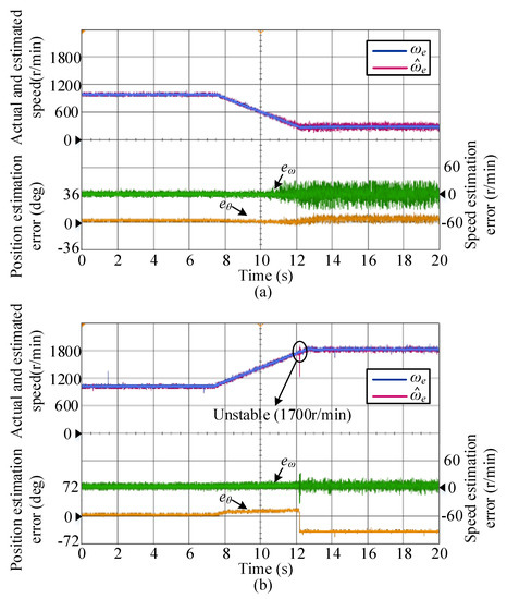 The performances of the STO with and from 1000 r/min to 300 r/min in closed-loop and from 1000 r/min to 1800 r/min in open-loop are shown in the Figure 12. In the process of motor speed decreasing from 1000 r/min to 300 r/min, the error of speed and position estimation increases significantly. That is because excessive sliding-mode gains lead to the large chattering of the estimated signals, resulting in severe chattering of the motor. It is dangerous to test the STO for the IPMSM in high speed range and closed-loop, so the speed is raised from 1000 r/min to 1800 r/min in open-loop. The corresponding performance is given in Figure 12b. The STO becomes unreliable at about 1700 r/min. At about 1700 r/min, the position estimation error jumps abruptly from 10.8 to −40 and the estimated speed has a large flutter. This means the IPMSM cannot operate at high speed over 1700 r/min in closed-loop. That is because the sliding-mode gains are too small to meet the stability conditions of STO. Experimental results presented in Figure 12 illustrate that the performance of STO in low and high speed range is limited by the constant sliding-mode gains and it is necessary to adopt speed-related adaptive sliding-mode gains.