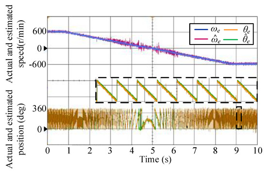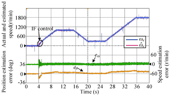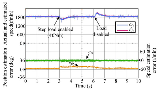 The dynamic performance of adaptive STO at 1800 r/min is shown in Figure 14. A 40 N·m load is enabled at 3 s and disabled at 6.2 s. The estimated speed can track the actual speed accurately and the estimated position error is less than 10.8 in the course of operation. The DC error of the position estimation increases by about 5 after loading and this is due to the mismatch of parameters caused by the increase of current after loading [12,31]. Hence, the performance of the adaptive STO could be verified.