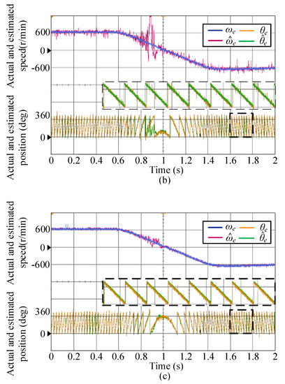The performances of traditional PLL, tangent-based PLL, and proposed improved PLL when the IPMSM turns from positive speed to reverse speed in open-loop are shown in Figure 15. For comparative purposes, three kinds of PLL operate under the same conditions: and . The speed command is turned from 600 r/min to −600 r/min at 0.6 s.