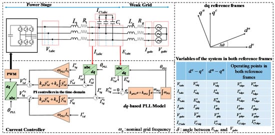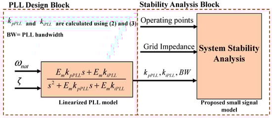 The second stage is the stability analysis block that determines whether the PLL designed in the previous block will be stable or unstable when used in a weak grid with known parameters. The stability analysis block is based on the simple state space model of the system in the dq reference frame proposed in this paper and discussed in Section 3. Both the system studied in this work, and the proposed small signal model will be discussed in the following sections. It is worth noting that the PLL design process shown in Figure 2 is flexible and can be used with any other PLL design procedure [].