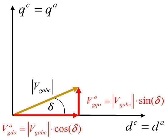 From (27) it is seen that the proposed model requires a steady-state operating point to be evaluated (considering that the system has a non-linear nature). In particular, the operating point of (27) is composed of four variables: these are: , , , and (see Figure 3). All of these are defined in the ARF—which is identical to the CRF if steady state operation is considered (assuming that the system is stable). The variable is equal to zero because the converter control is oriented to the d axis. Moreover, as discussed above, the variables of the operating point associated with the current (, ), in the ARF, can be approximated with the ones in the CRF: and . The remaining variable, , is derived in this section.