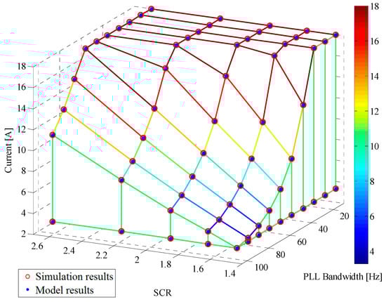 Maximum active current that the converter can be injected into the grid as a function of the PLL bandwidth and the SCR of the grid—Comparison between PLECs® simulation and the proposed small signal model (nominal active current = 18 A).