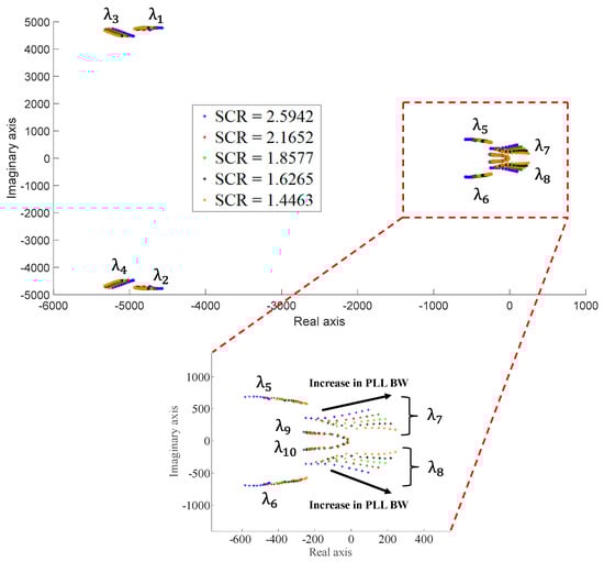 Eigenvalues of the proposed small signal model as a function of PLL bandwidths and SCRs.