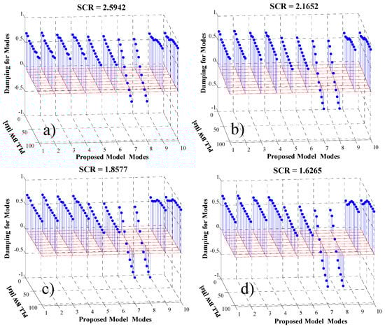 Damping of modes of the proposed small signal model as a function of the PLL bandwidth and the following short circuit ratios (SCR) of the weak grid: (a) SCR = 2.5942; (b) SCR = 2.1652; (c) SCR = 1.8577; (d) SCR = 1.6265.