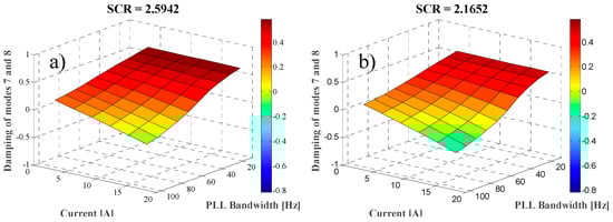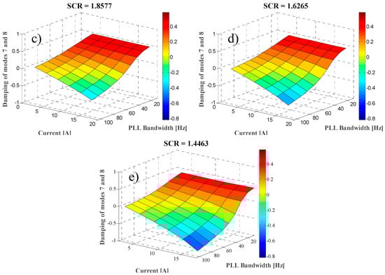 To explore stability for operating points other than rated, Figure 8 shows the damping ratio of modes 7 and 8 as a function of the PLL bandwidth and the active current supplied by the converter into the grid. It should be noted that to generate Figure 8, the linearised model (44) was evaluated for each operating point depicted in that figure. The figure shows the results for all the SCRs studied in this work (Table 3). The figure confirms that stability is adversely affected by the amount of the injected active current, with the damping of the modes decreasing as the current increases. Moreover, the decrease is steeper as the SCR decreases and as the PLL design bandwidth increases.
