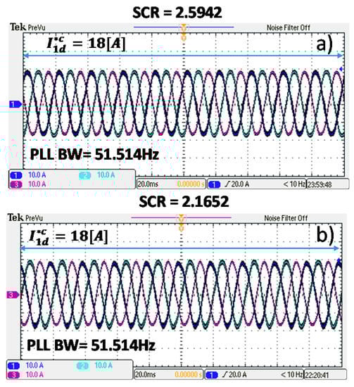 It should be pointed out that the current controller of the inverter shown in Figure 3 was designed for SCR = 2.5942, and controllers were kept constant for different SCRs. In this case, the closed-loop bandwidth of the current control loop is 200 Hz. The proportional and the integral gains are: and (see Figure 3). These PI controller gains are used to evaluate the model shown in (44). The same controller is used in the simulation work as well as in the experimental work.