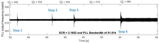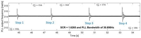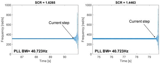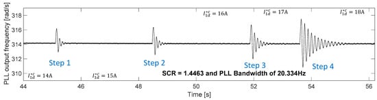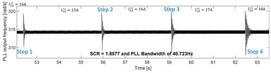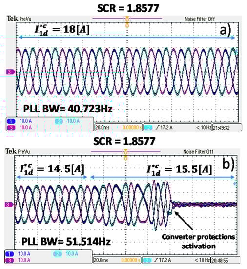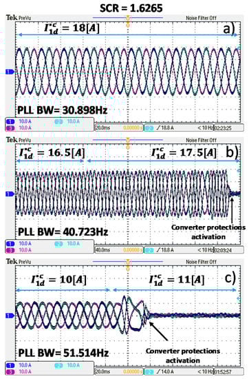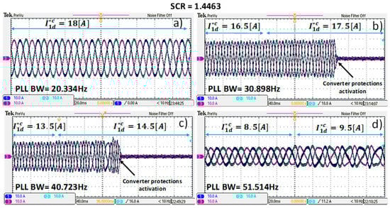 In each condition, the maximum active power current that the inverter can inject into the weak grid before the system becomes unstable is calculated with the proposed analytical model and with the PLECS simulation. Then, theoretical and simulation results are compared. The nominal active current of the inverter shown in Figure 3 is 18 A. It should be pointed out that to generate Figure 5 (model results), the linearised model (44) was evaluated for each of the operating points shown in that figure. It is worth remembering that the operating point of (44) is composed of four variables (, , , and ) as discussed in Section 3.4. In particular, considering that the control of the converter is orientated along the d axis, i.e., . Therefore, only the active power component of the current () supplied by the converter into the weak grid is studied. The rest of the operating points for evaluating (44) are generated as follows, Assume that model (44) is evaluated around an active current level of 10 A, which means that . is then calculated according (43). Finally, the stability of the system in that operating point can be studied as a function of the PLL bandwidth (by modifying and ) and the SCR of the weak grid. (By modifying ).