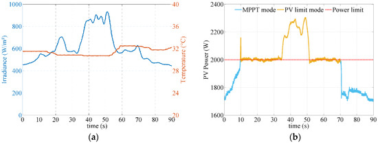 Figure 9 shows the results of a 90 second test of the “min” configuration, carried out on 25 July 2018, where is arbitrarily set to be constant at 2000 W. In Figure 9a, the continuous variance of the solar irradiance and PV cell temperature can be seen. Figure 9b shows that the MPPT algorithm is in control before the imposed PV power limit is reached. The PV generation increases as the irradiance goes up. As soon as and meet, the PV power limiting controller takes control. In Figure 9c, a sudden drop of voltage can be noted. At the beginning of this process, a sharp overshooting image can be observed in Figure 9b, which is caused by switching between the MPPT algorithm and the PI limited power controller. Also, the PV power is well constrained at 2000 W most of the time, despite some oscillations. On the other hand, exceeds the limitation for a while between the 34th second and 51st second. During this period, the PV voltage evolution (Figure 9c) proves that the voltage drops, and the system is saturated at the lower limit of 400 V. In this case, the “min” configuration can shed no more power. In this validation test, the excessive power is absorbed by the other components in the microgrid; thus, in Figure 9c the bus voltage is kept at 400 V. However, in a situation where the other components can absorb no more excessive power, this can cause severe accidents.
