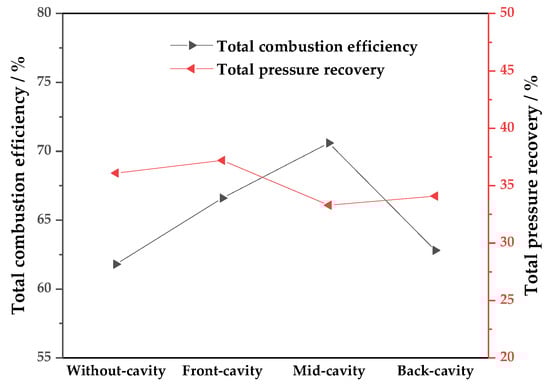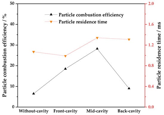 - Generally, the gas phase combustion is relatively complete. The total combustion efficiency mainly depends on the combustion efficiency of the particle-phase. The combustion efficiency of the mid-cavity configuration reaches about 70% and is the highest among the four configurations. However, all configurations display almost the same total pressure loss.