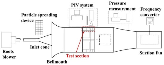 A 2D PIV system, developed by MicroVec Incorporation, is employed to measure two velocity components (axial and radial) simultaneously. A double-pulse Nd:YAG (Neodymium-doped Yttrium Aluminium Garnet; Nd:Y3Al5O12) laser generator is used to generate laser light with a maximum repetition rate of 15 Hz. The laser light with a wavelength of 532 nm and a pulse energy of 200 mJ is utilized. The resolution of CCD (Charge-Coupled Device) camera is 2048 × 2048 (4M) pixels. The accuracy and uncertainty of the PIV system could refer to paper [,]. Micro DEHS (Diisooctyl sebacate, C26H50O4) liquid drops are used as tracer particles, which are spread in the turbine main annulus during the measurement. The liquid drops, which are about 1 μm in diameter, produced by Laskin nozzles in a particle generator, are small enough to track the flow without introducing disturbance and large enough to scatter sufficient light to be captured by the CCD camera. A spreading net located upstream of the turbine inlet broadcasts the liquid drops into the flow uniformly.