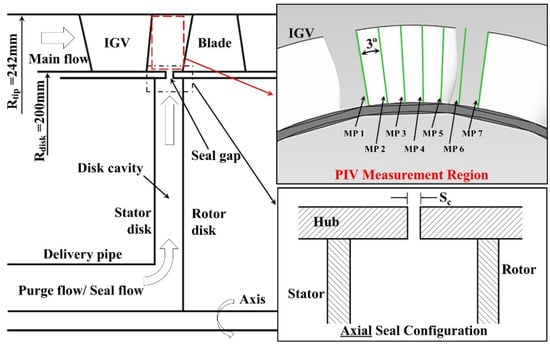 Structure of the research turbine with axial rim seal and PIV measurement region in annulus. IGV: inlet guide vane.