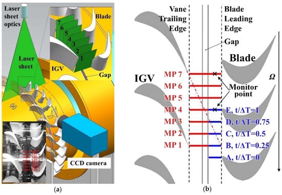 The influence of the rotor is taken into consideration and a phase-locking technique is used to capture the flow field at different blade positions for each measurement plane. Five trigger positions from A to E (due to periodicity, position E also corresponds to position A), blue highlight in Figure 3b, are arranged and aligned with the entrance of blade passage. These positions correspond to five time instants within a blade passing period ΔT: t/ΔT = 0, 0.25, 0.5, 0.75, 1 (from position A to E). Instantaneous images of flow field are captured by PIV at position A, when the rotor blade leading edge is aligned to the measuring plane exactly. Position C is a trigger for the middle of blade passage inlet, which is located circumferentially furthest from the blade leading edge. In order to evaluate the time-averaged blade influence, data on two radial lines are extracted from PIV measurement results. These two lines, in MP7 and MP4 respectively, are located downstream of the seal clearance and in the middle of the rotor platform (x/R = 0.11). In Figure 3b, two monitor points marked with X are the projections of the two lines on rotor platform.