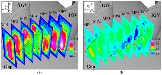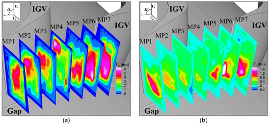 In Figure 4b, magnitude of is smaller than that of . The maximum of positive is less than one fourth of . shows both positive and negative value in the measurement planes, which is different with all positive in . The positive reveals the upward flow in the direction from hub to casing and negative is for downward. Area with negative is obvious in Figure 4b. Considering the periodicity, areas with negative starts from MP2 to MP1, and then develops from MP7 to MP3. This downward migration of negative reflects the influence of the leakage flow from guide vane. Areas with high positive are shown in MP6 and MP1, which reveals the outflow from disk cavity on account of disk pumping effect.