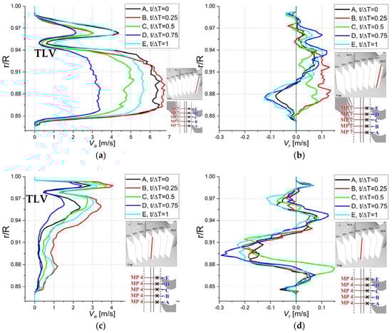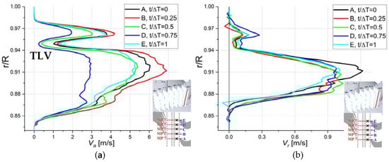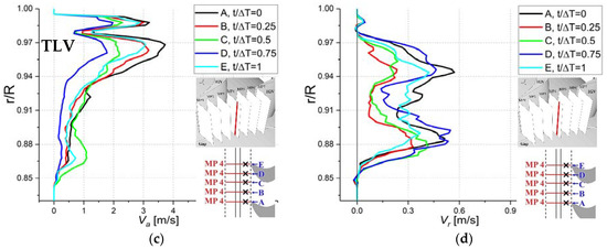 In the measurement plane, positive stands for flow migration from hub to casing and negative is for the opposite. Variations of are different in two measurement planes. However, an upward migration of fluid is caused after the rotor blade passing by. In Figure 5b, at position B & C keeps positive below r/R = 0.95 (out of TLV). becomes negative at other positions below r/R = 0.9. The fluid in lower half of MP7 moves upward after blade passing by (at position B & C) and turns to downward before the approaching of next blade leading edge (at position D & E/A). The upward flow caused by blade leads to a reduction in main annulus flow ingress [] and improves the heat transfer on rotor components. In MP4, the influence is unique at position C. The green line in Figure 5d moves to the right between r/R = 0.86 & 0.89 (scaled 17% of annulus height). In this range, positive at position C is largest and negative is smallest compared with other positions. This illustrates that position C promotes the upward migration, which increases the positive and decreases the negative.