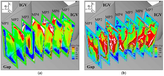 In Figure 7b, positive grow rates are extremely high. Purge flow promotes the fluid migration from hub to casing in the whole measurement domain. From MP7 to MP5, areas with high positive are located close to the blade side, which is due to the secondary flow influence. The trend line in Figure 7b shows the dramatic increase from MP7 to MP5 which corresponds to the trend line in Figure 4b determined by the radial flow structure. Red areas in MP3 and MP2 show high positive values, which is on account of the small denominator from shown in Figure 4b.