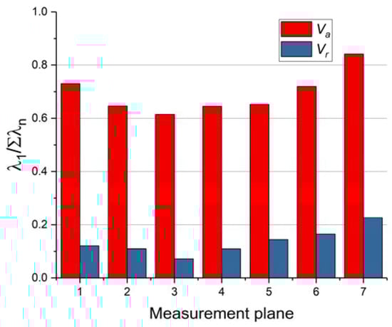 The contribution of the first order POD mode to the total energy in the measurement plane is normalized by energy fraction, /. Fraction variation among different measurement planes is reflected in Figure 9. Energy fractions of and in MP7 are largest in all measurement planes. Coherent structure in MP7 is less affected by the small-scaled random structures.
