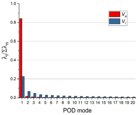 Figure 10 shows the normalized POD eigenvalues of the top 20 order POD modes of MP7 in Case 1. The bars reflect the contribution of each POD mode to the total kinetic energy of the flow field. The 1st-order mode of and contains 84.2% and 22.6% of the total energy, which are much larger than other higher-order modes respectively. Coherent structure in the first order mode represents the main flow structure with maximum kinetic energy in the measurement plane. Energy fraction of in first order mode is three times over , which explains a less turbulent flow in axial direction and a higher velocity fluctuation in radial.