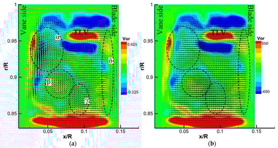 In this section, the influence of purge flow is discussed. Figure 6 shows the combined velocity fields in Case 2 with purge flow rate, . Compared with Case 1, the variation rate of velocity with purge flow intervention, calculated according to Equation (1), is shown in Figure 7. The positive rate stands for velocity increase and negative for decrease. White areas in Figure 7 stand for mathematical invalid data points with zero or an extremely small denominator (approximate to zero) during the calculation.