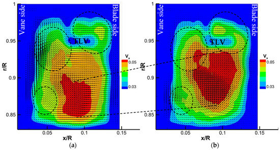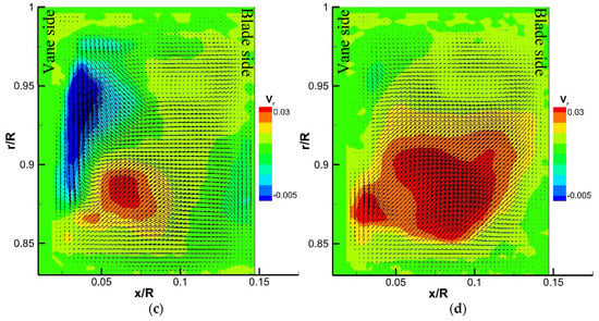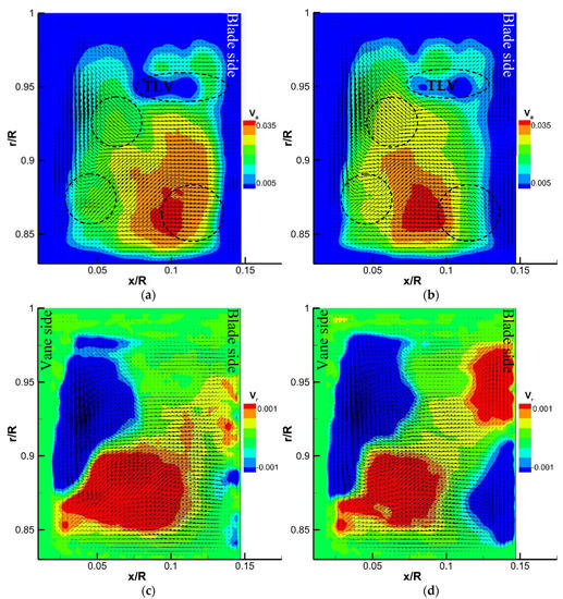 In Figure 12a, the core of area with high is located around x/R = 0.1 at position B (after the blade leading edge passes). While, the core migrates upstream to x/R = 0.08 at position D (before the blade leading edge approaches). The influence spreads to areas close to the vane side in Figure 12a. Area affected by TLV moves towards the blade side from position B to D.