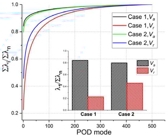 Instantaneous velocity fields could be treated as an original function. The principle of POD method is to decompose the original function into a sum of orthogonal basis functions , which are optimal in the least squares sense. (The construction of basis functions could rebuilt the original flow field.) The basis functions are also called POD modes, which are sorted in a descending order of the eigenvalues . represents the kinetic energy contained in the corresponding POD mode. The kinetic energy in each POD mode is unique. This property is treated as a characteristic to identify the structures with different levels of energy in the velocity field. Lower-order modes are related to the coherent structures (large-scale flow structures), especially the first order POD mode. While, higher-order modes contain random structures (small-scale structures). The principle equations of POD method are listed in the Appendix and detailed principles could also refer to paper [,].
