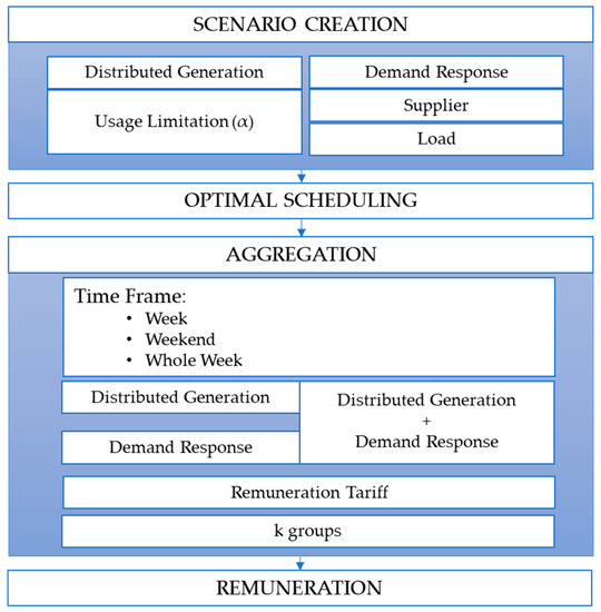 The proposed method considers resources as suppliers, DG units, and consumers enrolled in DR programs. Consumers may belong to IDR programs, where they are proportionately remunerated according to their contribution to reducing the overall load. Figure 1 presents a general diagram of the proposed methodology, showing the four phases: the definition of the input data, the optimum scheduling, the aggregation phase of the resources and the definition of the remuneration tariffs for each group.