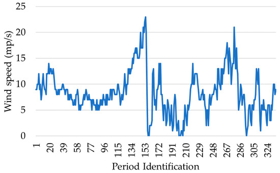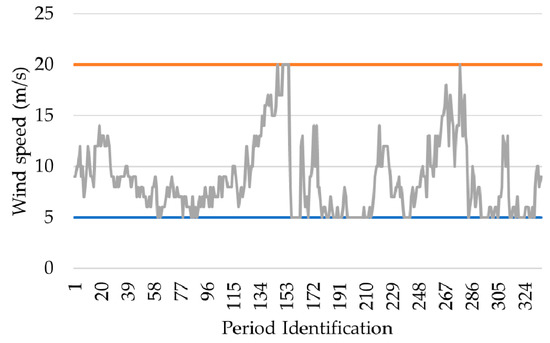 At low wind levels, there is not enough torque for the turbine blades to rotate. Thus, there is a minimum speed for them to start producing, the so-called cut-in speed, as illustrated in Figure 3. In this case study a value of 5 m/s was considered. The same situation applies to cases of high wind speeds which could risk damaging the rotor—this is called the cut-out speed—and for this case study 20 m/s was considered.