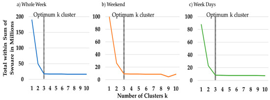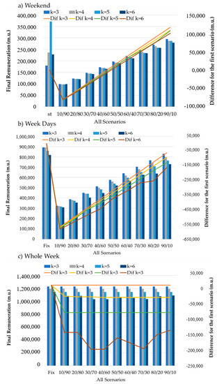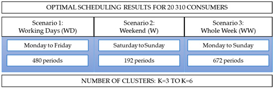 The aggregator is responsible for specifying these characteristics for each resource, in order to obtain proper results for this methodology. In this paper, the focus has been on studying consumers. Thus, three different scenarios (WD, W, and WW) were created to study the influence of aggregation on the remuneration of this type of resource, as presented in Figure 4. The definition of the number of clusters to be formed is decided by the VPP. In this paper, k = 1 wasn’t an option because would mean that all elements belonged to the same group and k = 2 could not form the best groups, the authors considered that k = 3 would be the initial value considered for the aggregation to be performed throughout this paper. The maximum number of k is k = 6. The authors established that this value would be the limit in order to be able to show different results without making the paper too extensive. Anyway, with the proposed methodology, the VPP can test as many k values as the situation requires in order to decide which solution suits best. It should be noted that the parameter k has no influence on scheduling since it is done a priori. Although, can influence in the formation of the remuneration groups and its tariffs. The main objective is to understand the way that the aggregation in each scenario will influence remuneration and which scenario is the most beneficial.