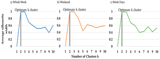 As stated in the methodology, VPP have freedom to study different k clusters. In addition to the proposed, the optimal number of clusters for this database will be identified. The Figure 5 and Figure 6 shows the results for the different scenarios for the Elbow Method and Silhouette Method, respectively. The first method presents k = 3 as the optimum k cluster, since this k is the one where the cost value decreases drastically and then hits a plateau. The second method presents k = 2 as optimum k cluster because the average silhouette width for this cluster was the higher one. However, k = 3 can also be considered an optimum k cluster because the difference between this one and k = 2 is low. This cluster was considered the selected scenario for a more detailed presentation in the next section. In this way, these two methods as overall indicate that the best number of DR programs to be implemented is 3.