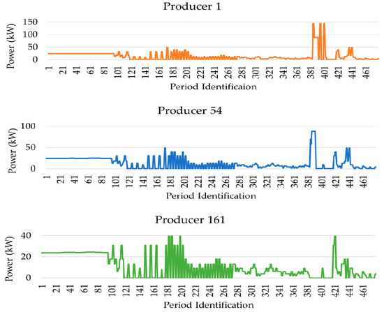 Although the main focus is on the consumers’ results regarding DR programs, the results of the optimization for wind generation, when k = 3, are presented. The results from one wind producer for each group found through k-means are presented in Figure 7.