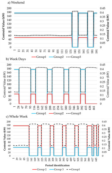 The selected clustering method, in addition to assigning the group to each element of the database, outputs the centroid of each group. Due to space constraints, it was not possible to display all values for all periods. Table 5 shows the maximum and minimum values of each group for the periods of each case.