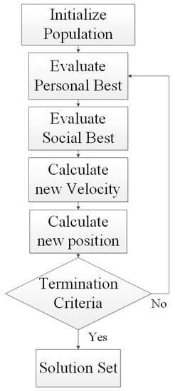 The ODGP problem consists of finding the optimal installation points for DG units (siting), along with their optimal capacity (sizing). To ensure a non-biased solution, apart from siting and sizing, the number of DG units to be installed and the total aggregated DG capacity to be penetrated, should be considered. Therefore, the solution should refer to the simultaneous optimization of all these four mentioned variables []. Moreover, as stated earlier, the ODGP is a MINLC optimization problem, subject to several constraints, and the computational volume is susceptible to exponential increase. In this paper, the problem is solved via PSO algorithm due to its ability to provide efficient solutions under minimum computational effort and a particular version of PSO called uPSO, developed by Parsopoulos and Vrahatis [].