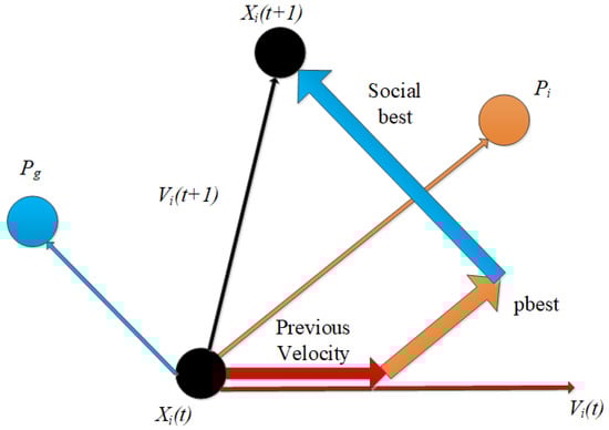 uPSO is a version of PSO in which the two basic versions of PSO, i.e., the Global and Local PSO are merged. The former promotes mainly the exploitation of the solution space, whereas the latter encourages mostly the exploration. Hence, uPSO aims to highlight their advantages while, in parallel, refraining their flaws, thus providing a better balance between exploration and exploitation of the solution space, and therefore improving the swarm’s ability to avoid local optima and reduce convergence time. In this paper a specific version of uPSO is used, using constriction factor and swarm partitioning, as shown in [], where the introduction of uPSO in the ODGP problem is presented and in [], where a more thorough comparative analysis of uPSO against other methods is contemplated. A generic flowchart and a vector diagram regarding the velocity and position determination are presented in Figure 1 and Figure 2.