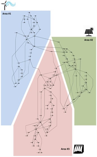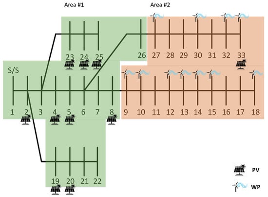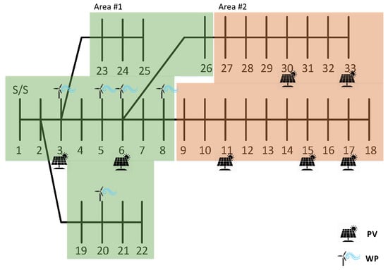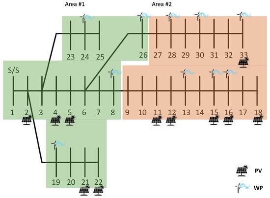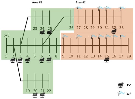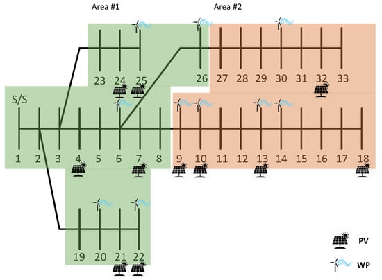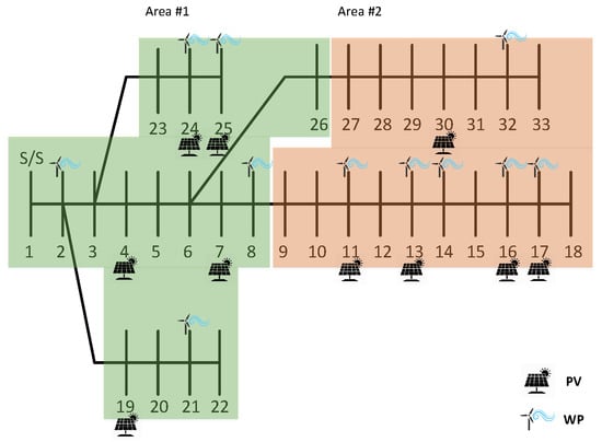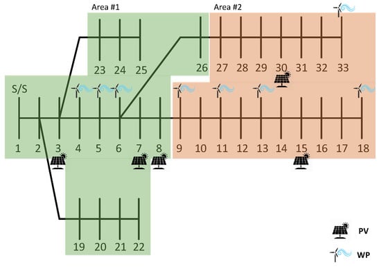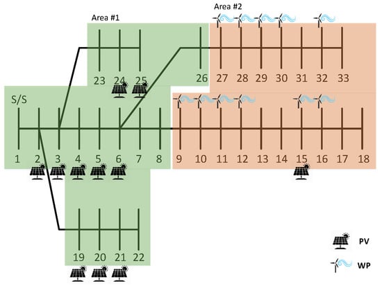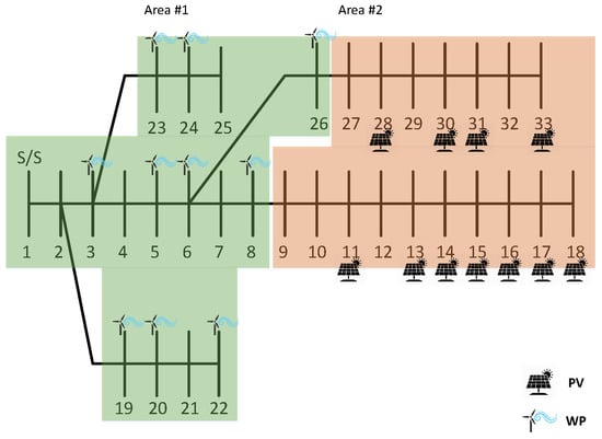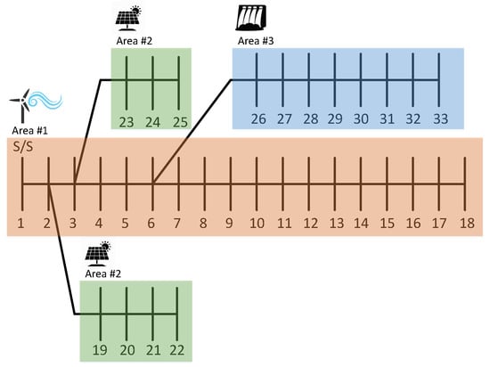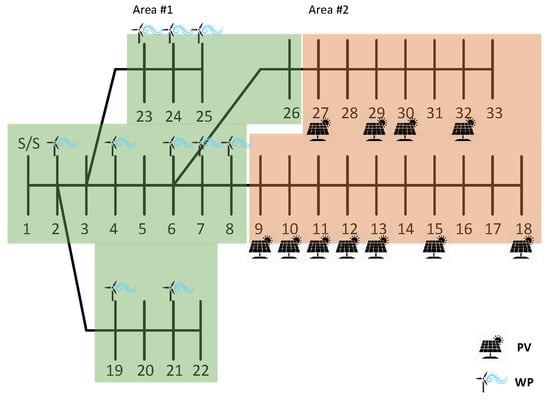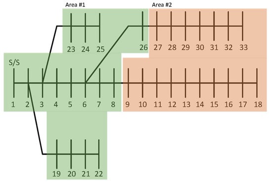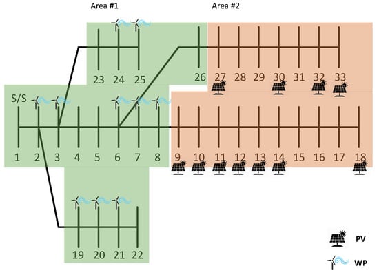 The proposed methodology for both ODGP and ORESP problems has been applied on the typical 33 [] and 118 [] bus systems. These DNs have been selected, in order to cover a wide application spectrum, since the first one is a radial network without DG units installed, whereas the second one is a meshed one, with a high penetration of DG units. To assign different capacity for the local natural resources at each node, each DN has been divided into three areas. Within each area each node is assigned a CF corresponding to the three examined RES technologies. Assuming that each area is relatively small, it is rational to accept that the nodes within each sub-area share the same CFs for the respective RES technologies. Figure 3 and Figure 4 present the aforementioned DNs, while the three areas with different CFs are suitably shaded.