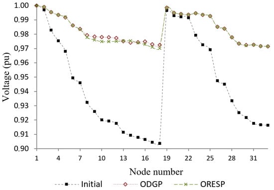 Voltage profile for 33 bus system regarding the ODGP and ORESP problems.
