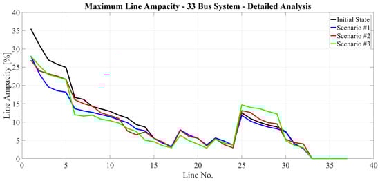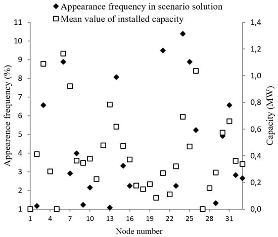 A crucial aspect of the ORESP problem formulation is the selection of the CF value of each node, since changes of the CFs of various RES types among the considered network areas or among the nodes of the same area, are expected to assign different power production capabilities for each node. Therefore, these changes are expected to prioritize specific nodes for RES installation with respect to others. This could be assumed valid, if the impact of each node’s position across the network for loss minimization is negligible. Therefore, it is accepted that the nodes with the highest CFs are expected to host the respective RES technologies. To investigate the impact of CF variations among the network, on both siting and sizing of RESs, a sensitivity analysis regarding all possible permutations for the CFs shown in Table 1 has been performed. The possible CF permutations of the same RES technology per column (i.e., for the 3 areas) is equal to six, thus considering three RES technologies for each DN the total scenarios examined is equal to . In Figure 6 the results provided by the sensitivity analysis concerning the 33 bus system are presented.