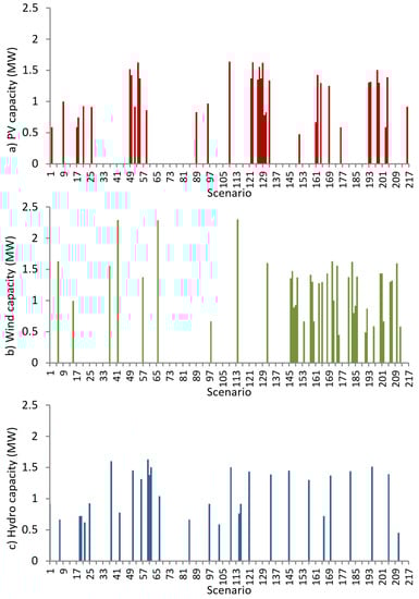 In Table 1 the values for the CFs used for this paper, as a case study, are presented. It should be stated that these values constitute typical values regarding PV, WT and HD units, respectively [,,]. Especially for HD units the possible values for their respective CF are either zero, if there is no availability of water resources in the area, or 0.45, if otherwise. Furthermore, as a base case scenario, the CFs have been assigned at each area, so that each resource would be promoted more than the others in a particular area, e.g., the WPs in area #1, as shown in Table 1 and also in Figure 3 and Figure 4.