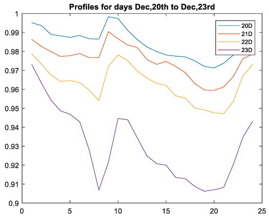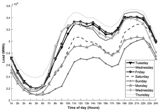 It is also important to quantify whether two profiles are similar enough to be considered the same type of day. In order to do so, Table 7 presents the maximum difference between each profile and its most similar pair. This measure expresses the difference between the profiles for two types of days. Specifically, it is the maximum percentage difference between the two 24 h profiles. It is a measure of how two profiles may or may not be equivalent and represent the same type of day. Both type-of-day categories are named at the top and bottom of the table. In this case, there is less than 1% difference between Tuesday, Wednesday and Thursday and, therefore these three categories are candidates for a joint category.