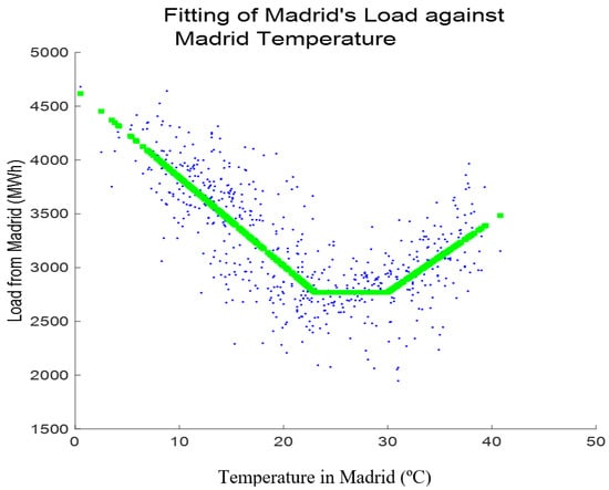 Figure 4. Scatter plot of load from the region of Madrid against temperature from the Madrid weather station. The linearization through HDDs and CDDs is shown in green.In order to model temperature inertia, the model includes the current value and lagged variables from all locations for the last two days. To sum up, the temperature variables include HDD and CDD series from five locations with the current and two lagged values. This treatment adds up to 30 variables. - Calendar data: The information about the type of day is critical as load profiles vary greatly from regular Mondays, to Fridays, Sundays, and even among holidays and special periods throughout the year. Therefore, a detailed classification is key to forecasting these special days accurately. In the starting model, 53 variables are used to classify the type of day along with eleven more to assign the month. The variables included in the model from these 53 variables are described in Table 1, Table 2, Table 3, Table 4 and Table 5.