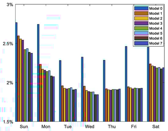 Even though the aim of this study is not regular days, it will help understand the rest of the results if this category is analyzed. The definition of the category remains unchanged through all eight models; however, more and more special days are removed from the category from model 1 to model 7 and, therefore, the modeling of regular days is more accurate. Figure 5 shows the changes in MAPE on each day of the week through all models. The largest improvement occurs from model 0 to model 1. This model is the first one to acknowledge the existence of special days. Nevertheless, accuracy increases continuously through model 7, especially on Sundays, Mondays and Saturdays.