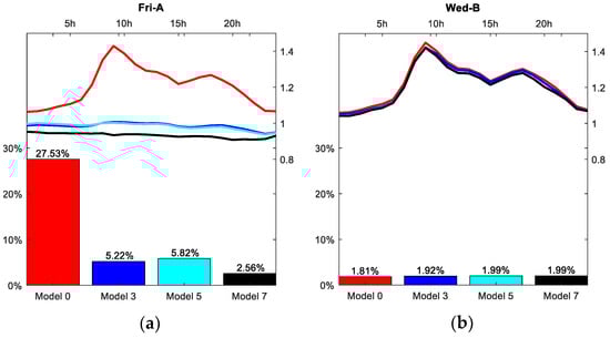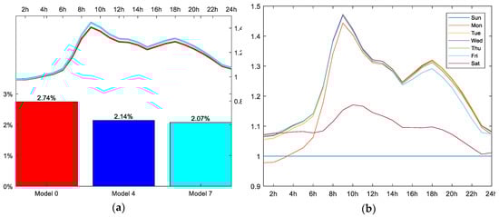 The change in the models can be seen in Figure 6a, in which the load profile and the reported MAPE for each model is shown for regular Mondays. The graph shows how the model 0 profile is lower than the other two, which are essentially equivalent. This is because model 0 models regular Mondays after all Mondays in the data set while models 4 and 7 exclude most or all special days, which have a lower profile. The rest of the regular days’ results are shown in Appendix A (Figure A1). In Figure 6b the profile for all days of the week from model 7 can be seen and how Monday has a lower start while Friday has a lower finish. Saturday has a unique profile and Tuesday, Wednesday and Thursday are very similar.