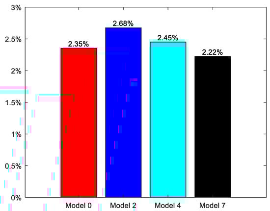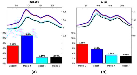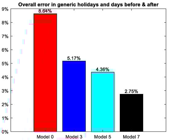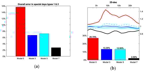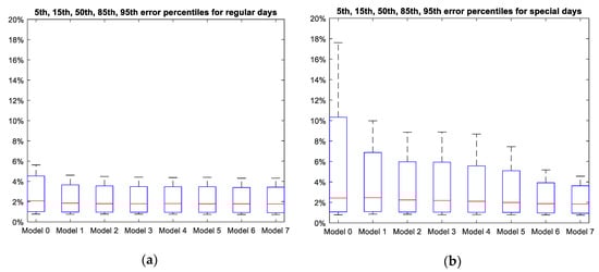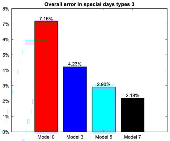 Special day types 1 and 2 include 11 fixed dates (see Table 1) that are considered to have specific load profiles. The models that introduce differences into these categories are 0 (all days are regular days), 3 (includes holidays and days before and after), 5 (distinguishes profiles for different days of the week) and 7 (each day is considered unique). Figure 7a shows the model accuracy of the category in these four models. Including these categories as general holidays or before/after holidays lowers the error from 15.6% to around 7%, but then considering each individual holiday yields a much better result of 2.8%. For these special days, assigning different profiles according to the day of the week (model 3 vs. 5) does not improve the result.