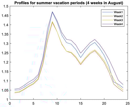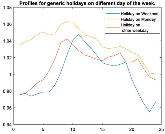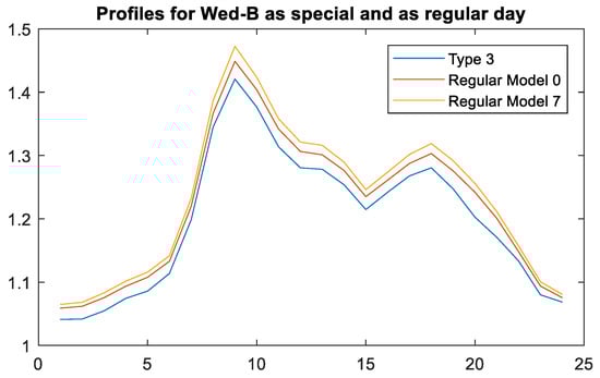 The use of categorical variables to formulate such classifications in linear regression models is very common [,,,,] and it is the same approach used in this paper. These categorical variables define the type of day and are translated into dummy binary categories that allow the regression model to estimate each type of day individually without any linear assumption among normal or special days.