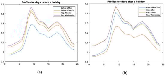 One issue that has not received as much attention as the forecasting engine is the forecasting of special days. Several days throughout the year show a profile that does not match the expected profile for its weekday. These differences may be caused by temperature [] but, the more extreme cases are caused by socio-economic effects of the calendar. In Figure 1, we can see how the load profile for a special day (1 November, a national holiday in Spain) has lower demand values with respect to any normal day. This and other special days are harder to forecast and incur higher forecasting errors that increase forecasting losses. This is especially important because a low average forecasting error with large peak errors may be costlier than a slightly less accurate forecast that has smaller peak errors. This research focuses on how to provide the proper information about these special days so that a forecasting engine may be able to forecast them more accurately.