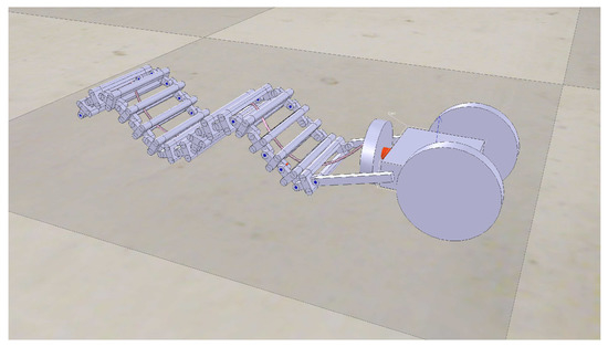 To acquire a preliminary feedback from a hardware implementation of the proposed robot, a modular structure including two wheel-legs modules and a two-arms manipulator (Figure 11), adapted from the Tribot robot [63], was tested. The two modules equipped with whegs are connected by a spring-based passive joint whereas an actuated joint is used to connect the front manipulator with the other modules. The front module contains of two arms with three degrees of freedom. The active joint is used to modify the manipulator configurations either improving locomotion capabilities when the arms are used as legs, or allowing object manipulation such as grasping when the manipulator is placed in the upper position. The mechanical structure is mainly developed using aluminum and plexiglass; these materials have been selected to guarantee a light weight for the robot. Relevant technical information including the robot mechanical characteristics are reported in Table 2.