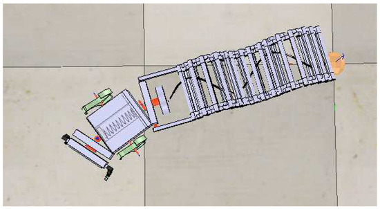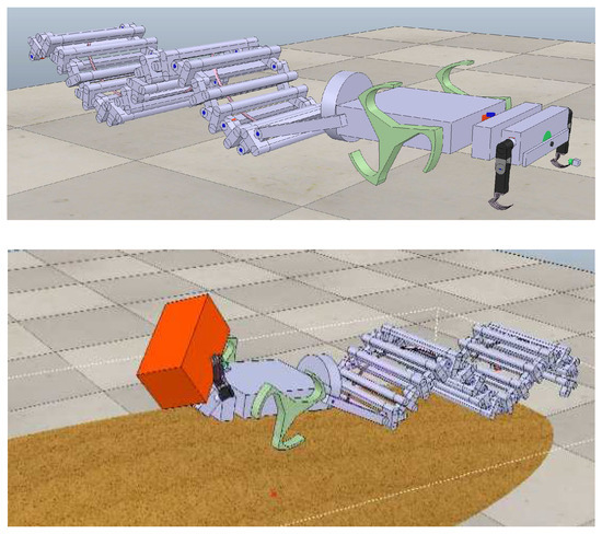 To evaluate the structure, the model was realized and simulated in a dynamic simulation environment called V-Rep [40]. This module, dedicated to forward thrust, is useful on terrains subject to landslides that can includes steep climbs. In these conditions, the presence of multiple contact points could be an important element to reduce slippage.