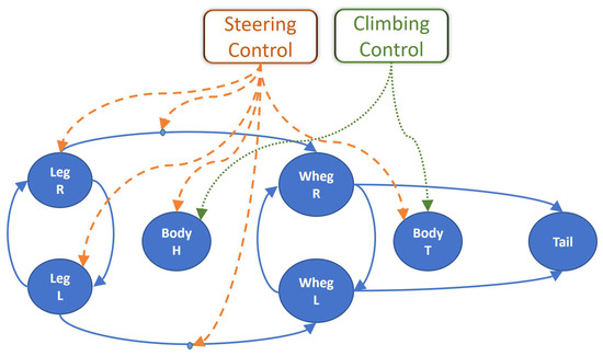 We can generalize this type of Laplacian diffusive connections using time-varying rotational matrix () in order to tune the whegs motion with the leg stepping, compensating the differences of the two kinematics structures. We can apply the same strategy to the tail taking into consideration the desired robot speed and the relations between the oscillator frequency and the tail wave length. The stability of locomotion gaits can be treated using the Contraction Theory, introduced in [53], and later on extended to Partial Contraction [54] that we already successfully applied in a hexapod robot whose CPG was developed using the same basic oscillators [28,55]. This efficiently handles the problem with exponential convergence to behaviors and to specific relations among the state variables of the control system. Finally, descending commands for navigation control and behavior selection (e.g., steering and climbing control), can modify the network dynamics by selecting the suitable parameters at the level of neurons and connection to be tuned [51,56].